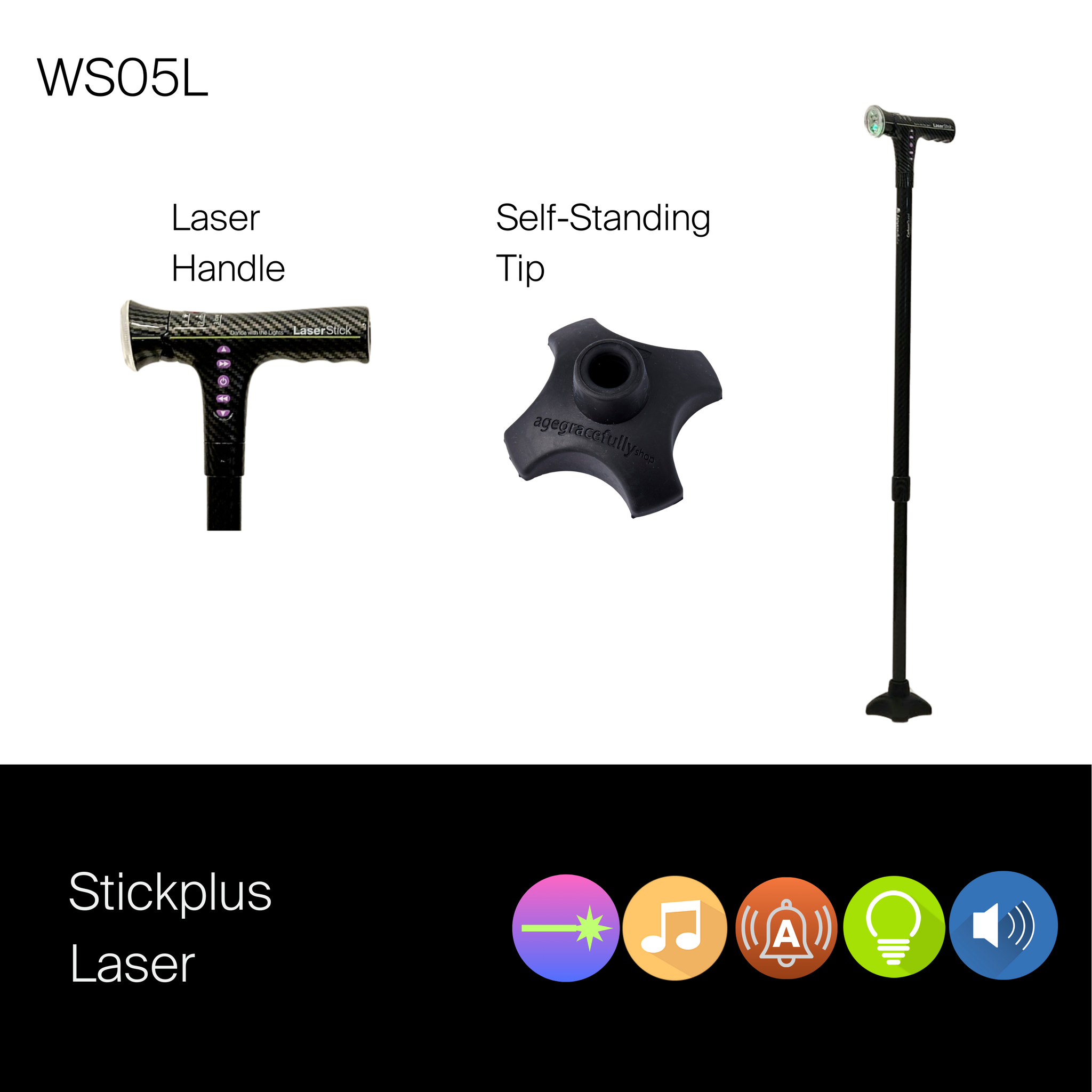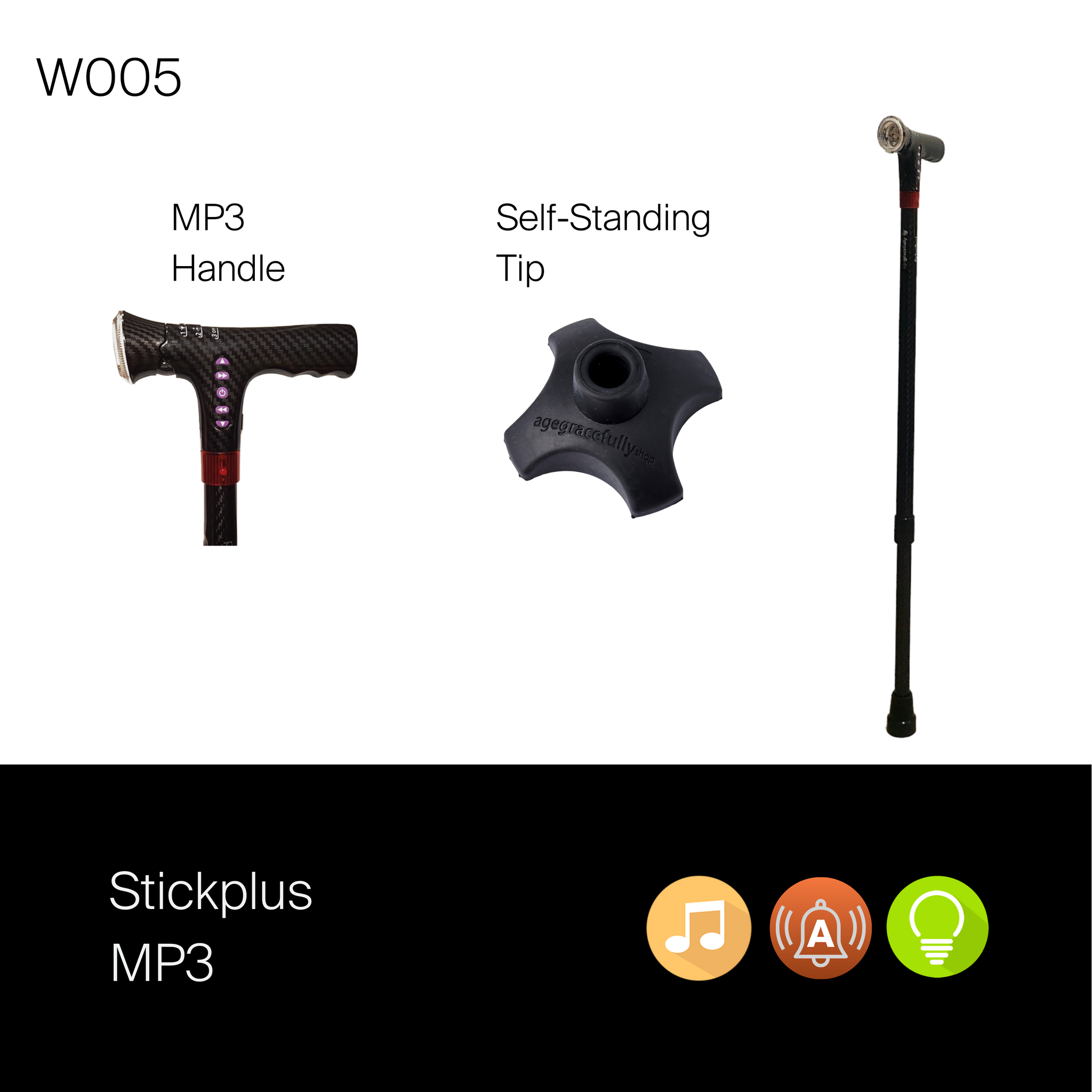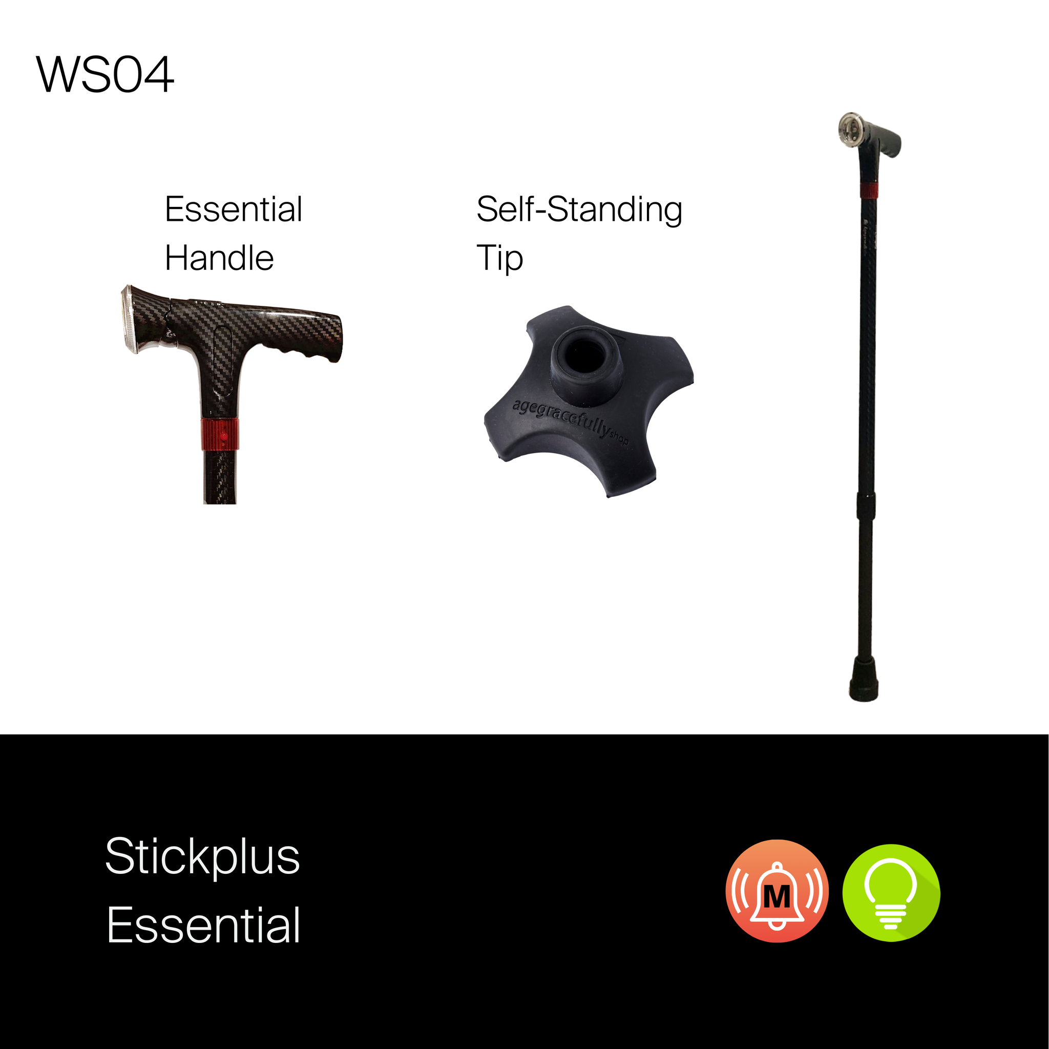 The bottom tubing of Stickplus is embedded with a positioning groove and screw thread to enable flexibility in switching to a more stable interchangeable quad. The package includes a single tip and an Anti-slip Self-stand tip. Users can also purchase a Medium or Small Quad Base separately.
